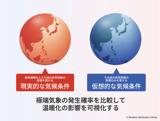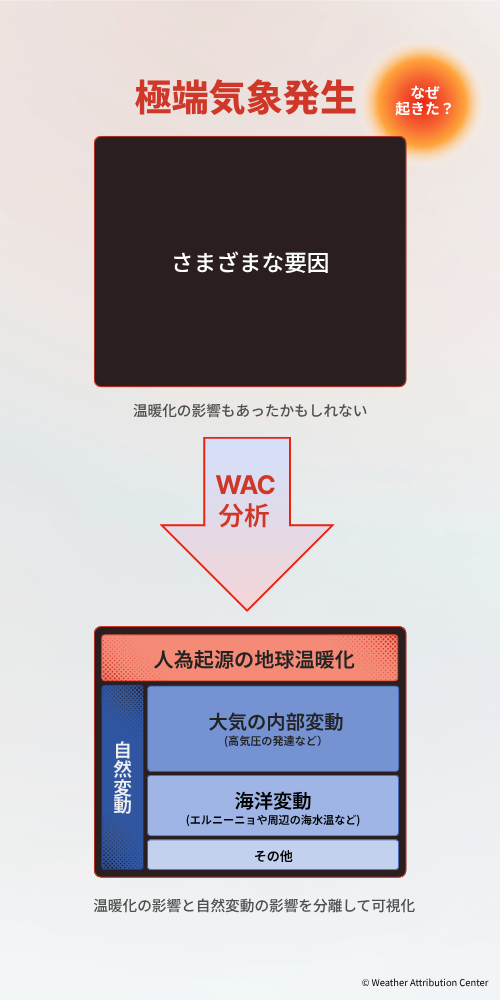 極端気象アトリビューションセンター(WAC: Weather Attribution Center)は、日本各地で発生した極端気象について、人間活動による地球温暖化やその他の気候変動がどの程度影響しているかを「イベント・アトリビューション」という科学的手法で分析し、その結果を公表しています。