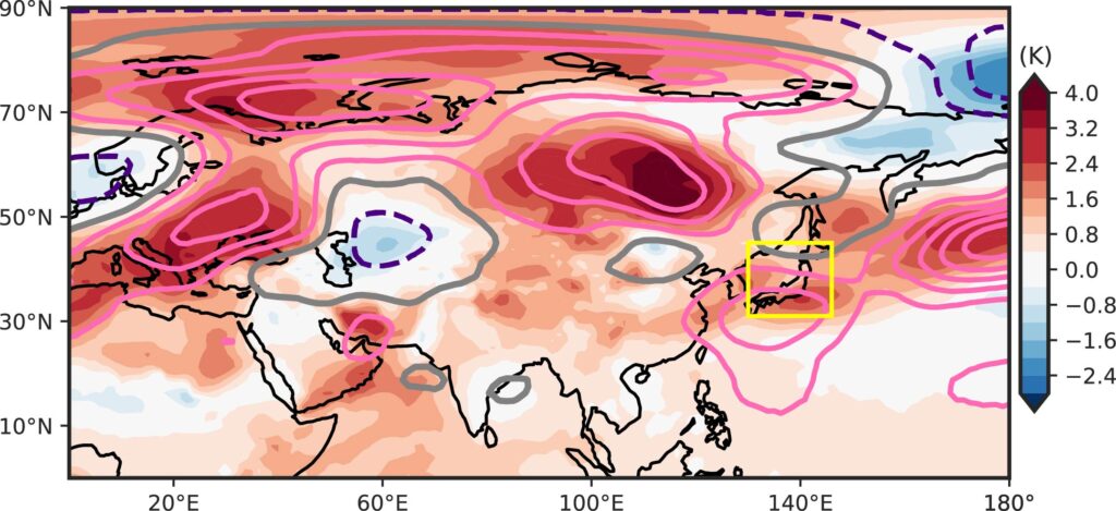 また、図2の青実線が薄い青色の山型に比べて右にずれていることから、この時期の自然の内部変動が日本の気温を底上げする働きをしていたことが分かります。ここで言う自然の内部変動の中には、日本近海の海面水温が高かったことによる影響も含まれている可能性があります。